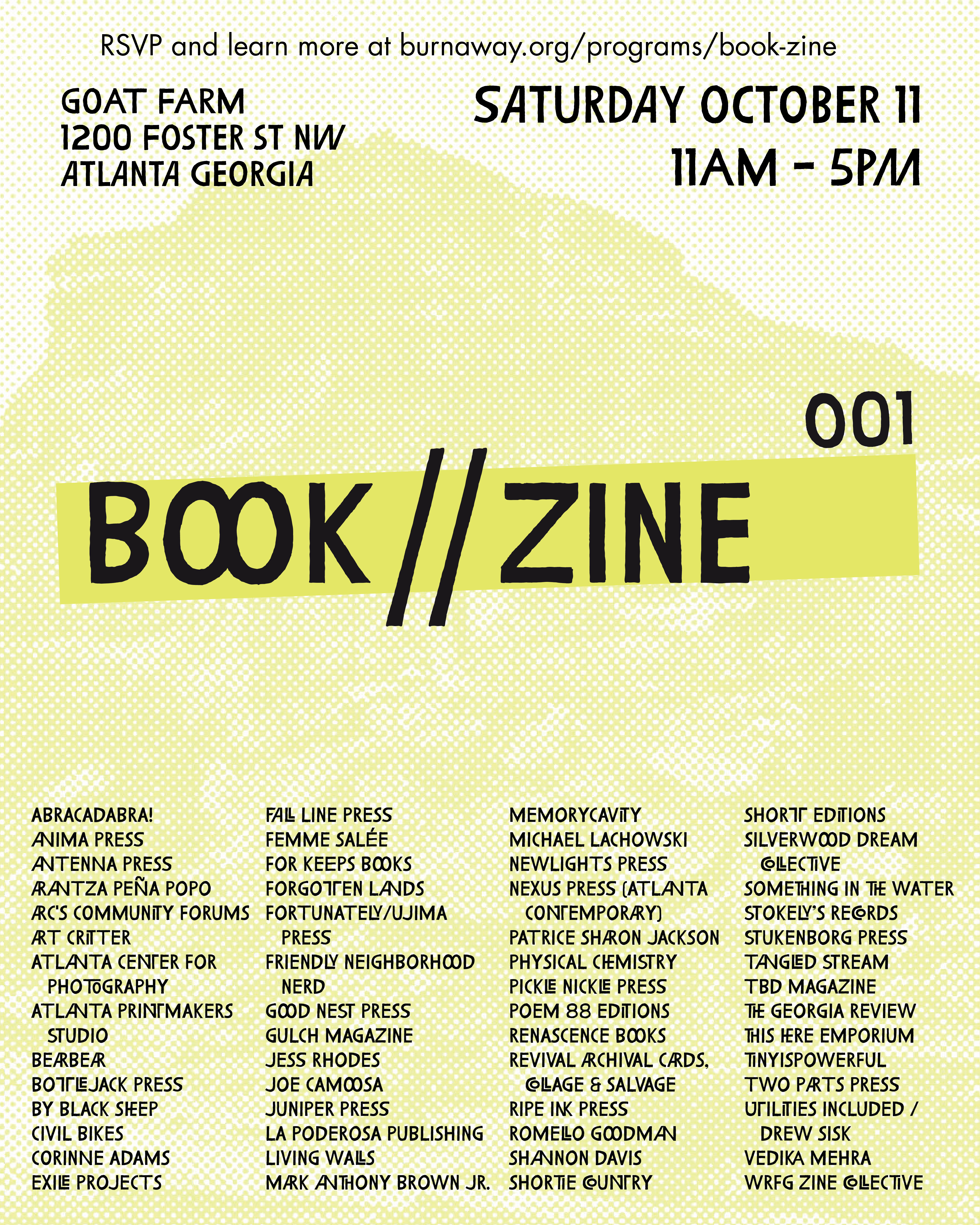 EXILE Projects will be tabling at Book//Zine, Burnaway’s inaugural small press fair, on Saturday, October 11, 2025, from 11 AM to 5 PM at The Goat Farm in Atlanta, Georgia. This first annual art book and zine fair brings together independent publishers, small presses, makers, writers, and artists from across the region. Come visit us and explore a curated selection of publications from South Florida’s vibrant print scene.
