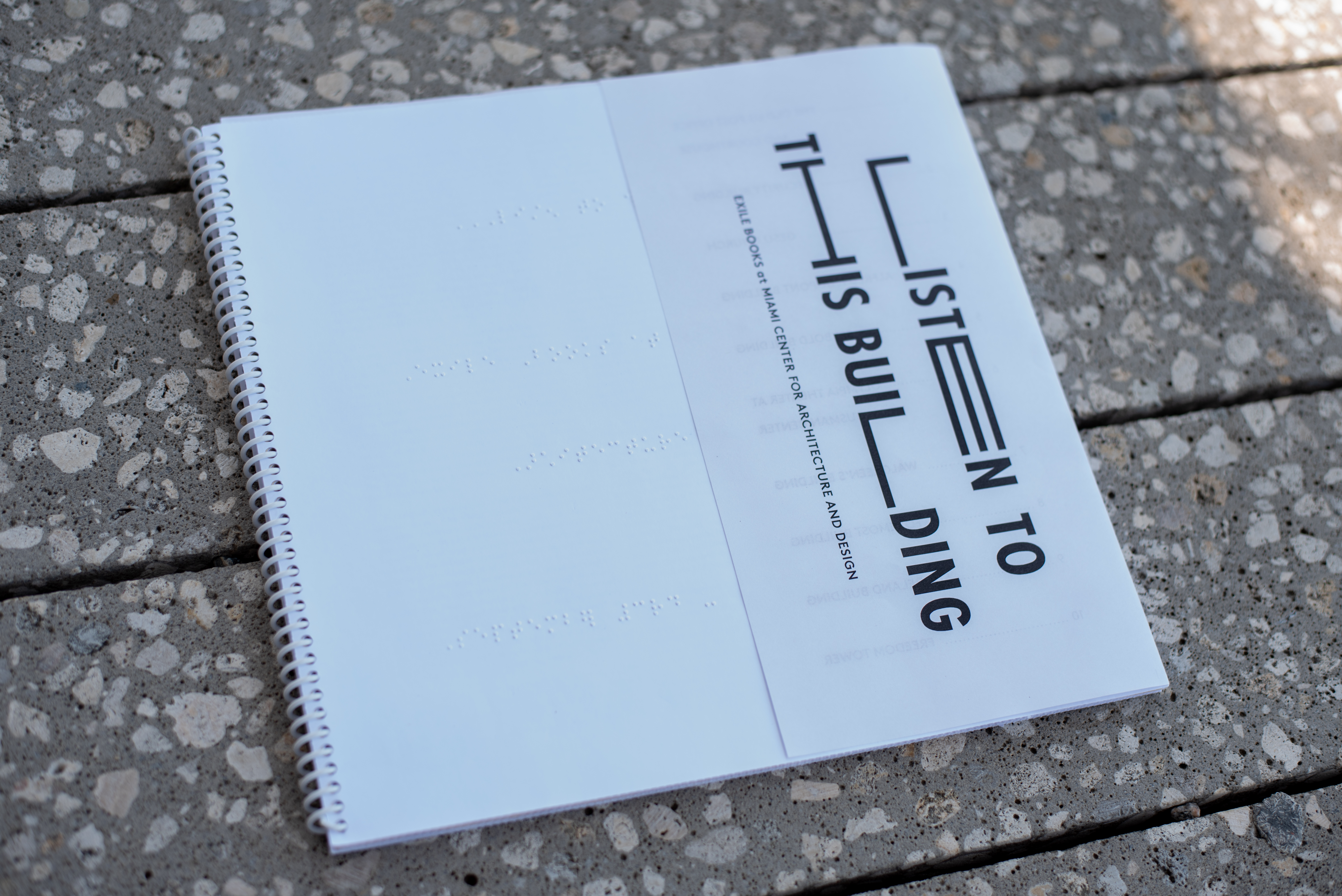 LISTEN TO THIS BUILDING was a groundbreaking program that sought to bridge the understanding between downtown Miami architecture, independent publishing, and accessibility, specifically addressing visual impairments. To commemorate the exhibition at the Miami Center for Architecture & Design, EXILE produced an artist’s book in which architectural narratives were rendered via touch and sound. There were no photographs or printed text in the publication, only tactile reliefs of each building, effectively compelling the viewer to experience Miami through new and distinct paradigms. Opening September 3, 2015, the exhibition coincides with the 25th anniversary of Americans with Disabilities Act. In doing so, it brought together tactility, sound, and thematic programming to explore alternative modes of experiencing one's city and better understand how those without sight navigate their surroundings and advocate for universal design.