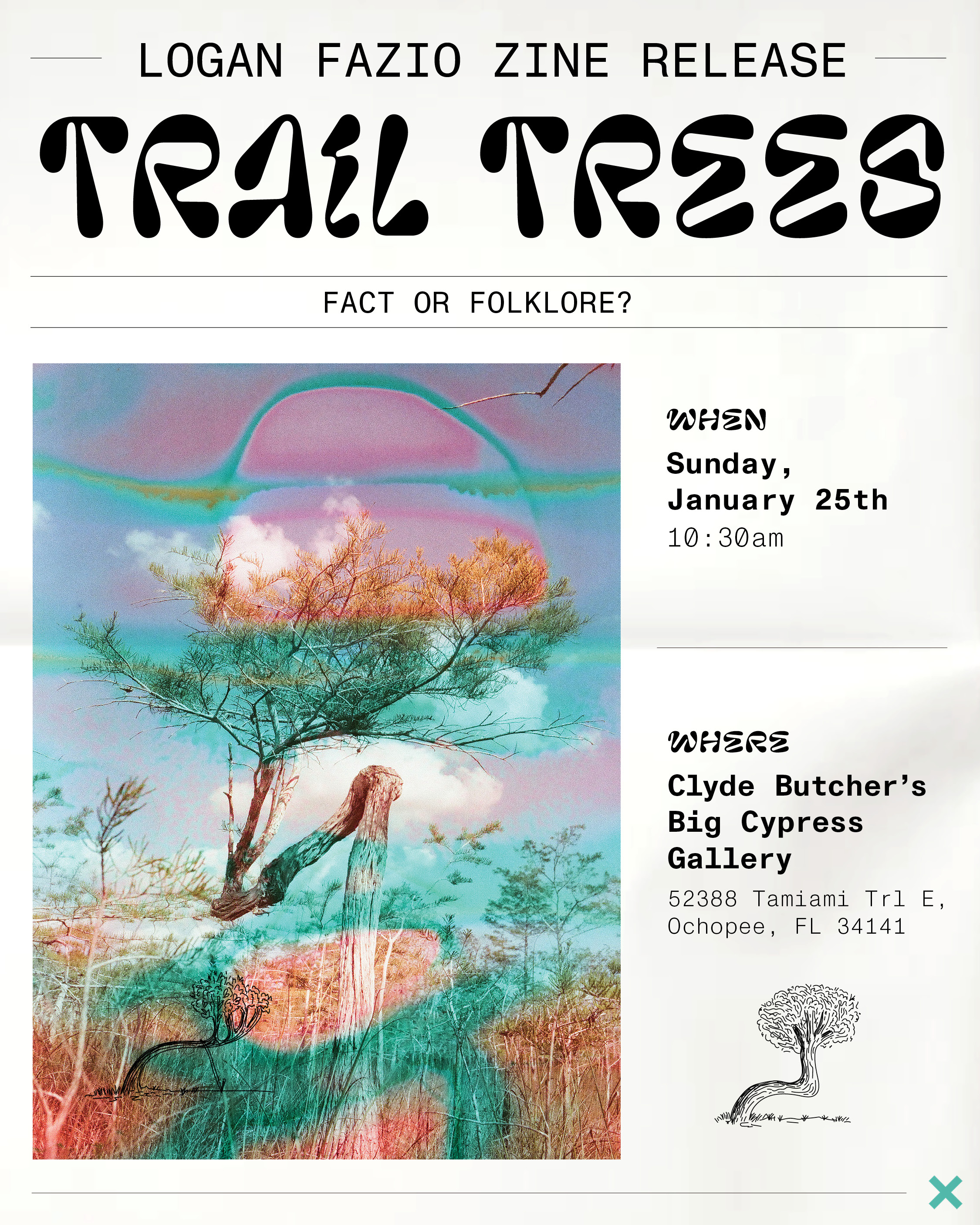 | Join us on Sunday, January 25 at 10:30 a.m. at Clyde Butcher’s Big Cypress Gallery to celebrate the release of Trail Trees, a new zine by Logan Fazio. We’ll gather in the gallery to browse the exhibition and hear from the artist about her discovery and fascination with trail trees across the Everglades. Afterward, we’ll take a short guided walk to visit one of these remarkable trees in person. Nestled within 13 acres of Big Cypress National Preserve, this event offers a rare chance to explore both art and landscape together. Space for the guided walk is limited and offered on a first-come, first-served basis. Please RSVP to info@exilebooks.com to reserve your spot and receive a complimentary copy of the zine. |