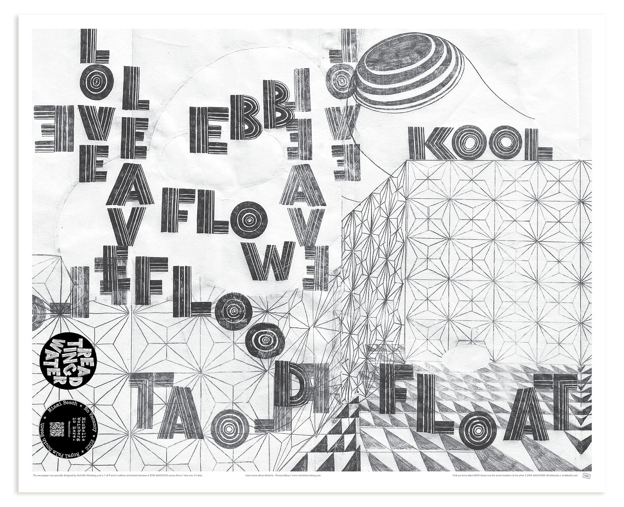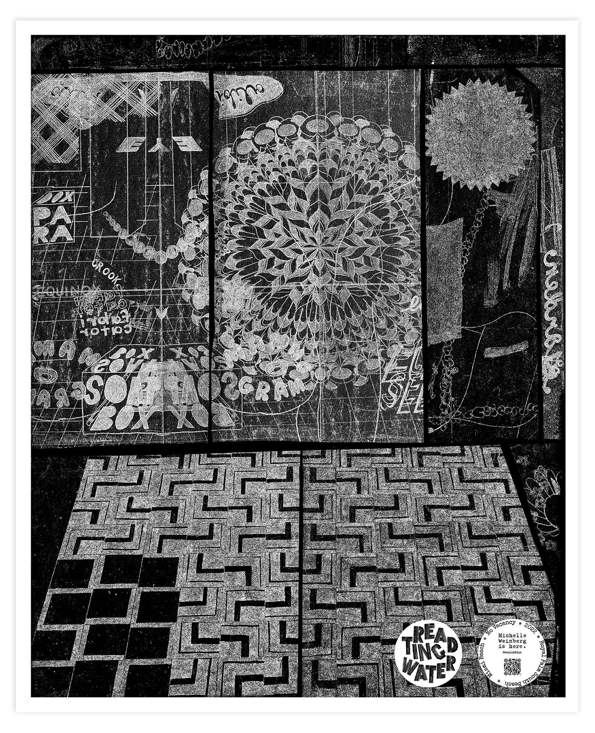 Treading Water, 2022Treading Water is the product of my drawing process using carbon transfer, a kind of pseudo-printing process. One side of the printed broadside shows the “positive” (the original drawing on paper), the other is the "negative” (composed of used carbon papers engraved with the layered residue of my drawing marks over time). The carbon paper marks are made visible only when illuminated or backlit. These works illustrate the collision of forces from the natural world acting on the fragile built environment, prompting erosion and disintegration. Letter forms are banal slogans and notes to self, fragmented broadcasts, set free from normal context.